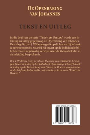 Drs. J. Willemse (1873-1935) was theoloog en predikant in Groningen. Naast de uitleg op het bijbelboek Openbaring, schreef hij ook de uitleg op de Tweede brief van Petrus, de Brieven van Johannes en de Brief van Judas, welke ook verscheen in de serie “Tekst en Uitleg.”