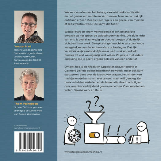 We kennen allemaal het belang van intrinsieke motivatie en het geven van ruimte en vertrouwen. Maar in de praktijk ontstaan er toch steeds weer regels, een gevoel van moeten of zelfs wantrouwen. Hoe komt dat toch?Wouter Hart en Thom Verheggen zijn een belangrijke oorzaak op het spoor: de oplossingenmachine. Die zit in ieder van ons, is overal aanwezig en doet verborgen of duidelijk zichtbaar haar werk. De oplossingenmachine zet spannende vraagstukken om in kant-en-klare oplossingen. Dat lijkt verschrikkelijk aantrekkelijk, maar leidt vaak onbedoeld precies tot wat we eigenlijk níet willen. Zo pak je met iedere oplossing die je geeft, ergens ook iets van een ander af.Ontdek hoe jij als Afpakker, Oppakker, Brave Hendrik of Calimero zelf die oplossingenmachine voedt, maar ook kunt stopzetten. Lees over de kracht van vragen, het vinden van haakjes en de kunst van niet te veel, maar wél genoeg. Een boek vol kleine verhalen en de lessen die daarin schuilgaan over verantwoordelijkheid geven en nemen. Over moeten en willen. Op ons werk en thuis.