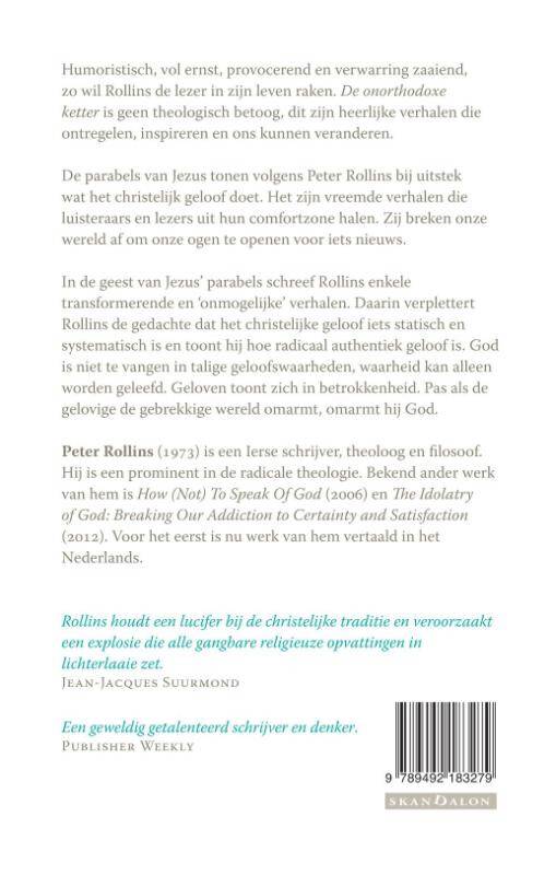 Tweede druk. Humoristisch, vol ernst, provocerend en verwarring zaaiend, zo wil Rollins de lezer in zijn leven raken. De orthodoxe ketter is geen theologisch betoog, dit zijn heerlijke verhalen die ontregelen, inspireren en ons kunnen veranderen. De parabels van Jezus tonen volgens Peter Rollins bij uitstek wat het christelijk geloof doet. Het zijn vreemde verhalen die luisteraars en lezers uit hun comfortzone halen. Zij breken onze wereld af om onze ogen te openen voor iets nieuws. In de geest van Jezus' parabels schreef Rollins enkele transformerende en 'onmogelijke' verhalen. Daarin verplettert Rollins de gedachte dat het christelijke geloof iets statisch en systematisch is en toont hij hoe radicaal authentiek geloof is. God is niet te vangen in talige geloofswaarheden, waarheid kan alleen worden geleefd. Geloven toont zich in betrokkenheid. Pas als de gelovige de gebrekkige wereld omarmt, omarmt hij God. Werk van JEROEN BOSCH siert de omslag. Met absurdistische beeldtaal brak Jeroen Bosch door de kaders van een verouderd tijdperk heen; net zo confronterend, verwarrend en toch ook hilarisch zijn de verhalen van Peter Rollins. Niets is meer wat het lijkt - zeker God niet.