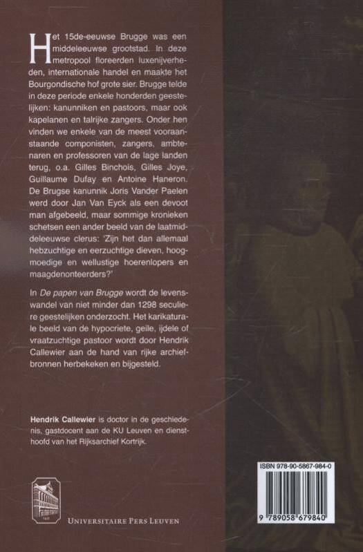 Het karikaturale beeld van de losbandige middeleeuwse geestelijken Herbekeken. Het 15de-eeuwse Brugge was een middeleeuwse grootstad. In deze metropool floreerden luxenijverheden, internationale handel en maakte het Bourgondische hof grote sier. Brugge telde in deze periode enkele honderden geestelijken: kanunniken en pastoors, maar ook kapelanen en talrijke zangers. Onder hen vinden we enkele van de meest vooraanstaande componisten, zangers, ambtenaren en professoren van de lage landen terug, o.a. Gilles Binchois, Gilles Joye, Guillaume Dufay en Antoine Haneron. De Brugse kanunnik Joris Vander Paelen werd door Jan Van Eyck als een devoot man afgebeeld, maar sommige kronieken schetsen een ander beeld van de laatmiddeleeuwse clerus: ‘Zijn het dan allemaal hebzuchtige en eerzuchtige dieven, hoogmoedige en wellustige hoerenlopers en maagdenonteerders?’ In ‘De papen van Brugge’ wordt de levenswandel van niet minder dan 1298 seculiere geestelijken onderzocht. Het karikaturale beeld van de hypocriete, geile, ijdele of vraatzuchtige pastoor wordt door Hendrik Callewier aan de hand van rijke archiefbronnen herbekeken en bijgesteld.