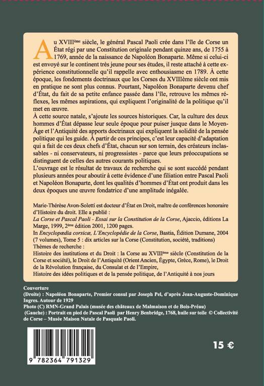Au XVIIIème siècle, le général Pascal Paoli crée dans l’île de Corse un État régi par une Constitution originale pendant quinze ans, de 1755 à 1769, année de la naissance de Napoléon Bonaparte. Même si celui-ci est envoyé sur le continent très jeune pour ses études, il reste attaché à cette expérience constitutionnelle qu’il rappelle avec enthousiasme en 1789. À cette époque, les fondements doctrinaux que les Corses du XVIIIème siècle ont mis en pratique ne sont plus connus. Pourtant, Napoléon Bonaparte devenu chef d’État, du fait de sa petite enfance passée dans l’île, retrouve les mêmes réflexes, les mêmes aspirations, qui expliquent l’originalité de la politique qu’il met en Åuvre. À cette source natale, s’ajoutent les sources historiques. Car, la culture des deux hommes d’État dépasse leur seule époque pour puiser jusque dans le Moyen Âge et l’Antiquité des apports doctrinaux qui expliquent la solidité de la pensée politique qui les guide.