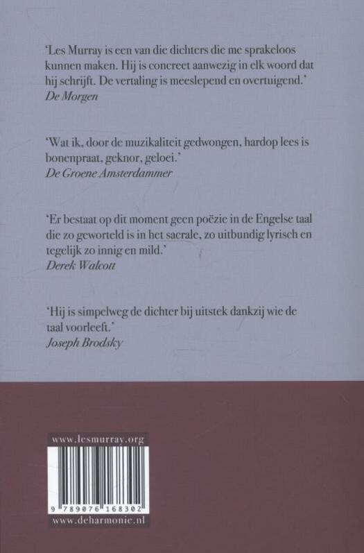 Les Murray bezingt de rijkdom van het leven in verhalende gedichten, aforistische fragmenten, portretten van mensen en dieren en de Australische outback, nu eens vol zelfspot en humoristisch provocerend, dan weer innig en gemoedelijk.
