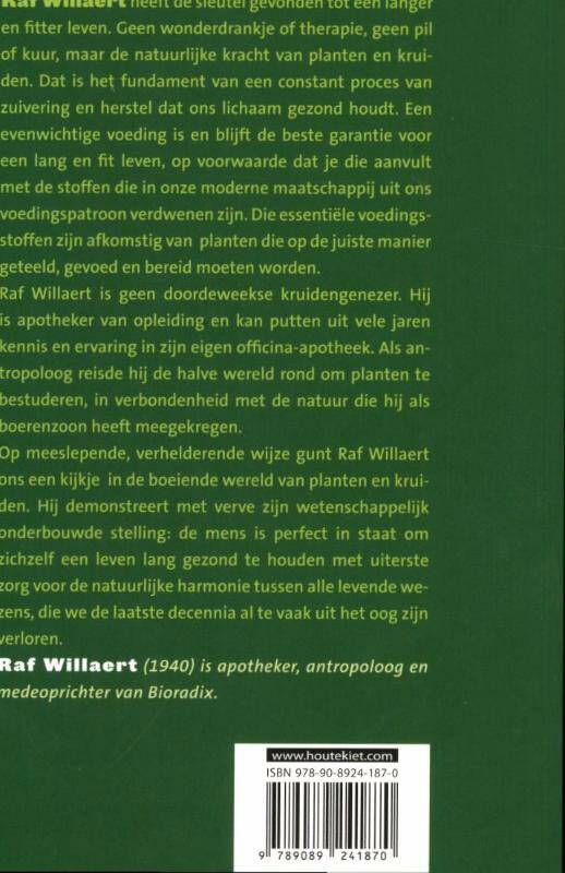 Op meeslepende, verhelderende wijze gunt Raf Willaert ons een kijkje in de boeiende wereld van planten en kruiden. Hij demonstreert met verve zijn wetenschappelijk onderbouwde stelling: de mens is perfect in staat om zichzelf een leven lang gezond te houden met uiterste zorg voor de natuurlijke harmonie tussen alle levende wezens, die we de laatste decennia al te vaak uit het oog zijn verloren.