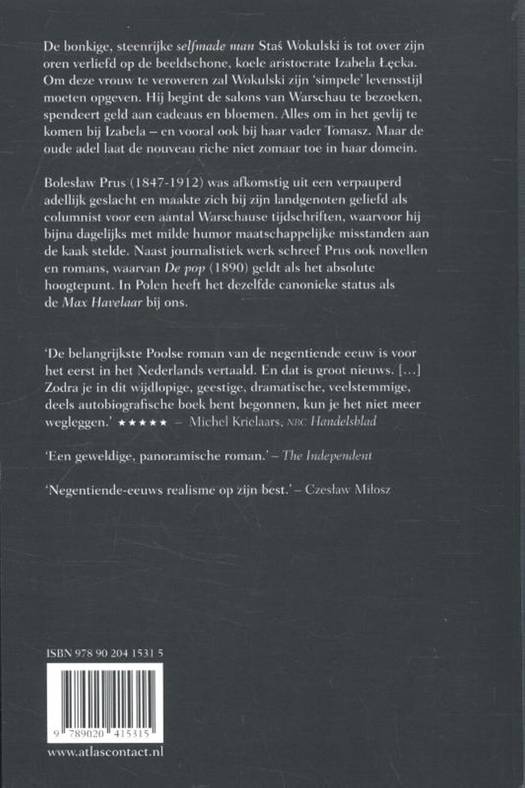 Wat 'Madame Bovary' is voor de Franse literatuur en 'Anna Karenina' voor de Russische is 'De pop' voor de Poolse. Velen beschouwen het magnum opus van Boleslaw Prus als de grootste Poolse roman van de negentiende eeuw – of zelfs van alle tijden. Net als in die andere twee epische meesterwerken staat ook in 'De pop' een tragische liefdesgeschiedenis centraal. De bonkige, steenrijke selfmade man Stás Wokulski is tot over zijn oren verliefd op de beeldschone, koele aristocrate Izabela Lecka. Om deze vrouw te veroveren zal Wokulski zijn 'simpele' levensstijl moeten opgeven. Hij begint de salons van Warschau te bezoeken, spendeert geld aan cadeaus en bloemen. Alles om in het gevlij te komen bij Izabela – en vooral ook bij haar vader Tomasz. Maar de oude adel laat de nouveau riche niet zomaar toe in haar domein. Behalve een aangrijpend liefdesverhaal is 'De pop' daarmee ook een roman over de verwoestende werking van klasseverschillen.