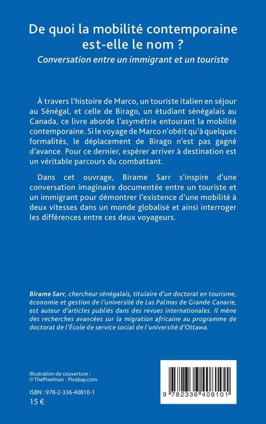 À travers l'histoire de Marco, un touriste italien en séjour au Sénégal, et celle de Birago, un étudiant sénégalais au Canada, ce livre aborde l'asymétrie entourant la mobilité contemporaine. Si le voyage de Marco n'obéit qu'à quelques formalités, le déplacement de Birago n'est pas gagné d'avance. Pour ce dernier, espérer arriver à destination est un véritable parcours du combattant. Dans cet ouvrage, Birame Sarr s'inspire d'une conversation imaginaire documentée entre un touriste et un immigrant pour démontrer l'existence d'une mobilité à deux vitesses dans un monde globalisé et ainsi interroger les différences entre ces deux voyageurs.