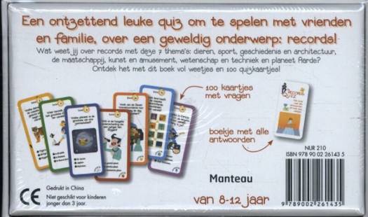 Een ontzettend leuke quiz om te spelen met vrienden en familie, over een geweldig onderwerp: records! Wat weet jij over records met deze 7 thema's: dieren, sport, geschiedenis en architectuur, de maatschappij, kunst en amusement, wetenschap en techniek en planeet Aarde? Ontdek het met dit boek vol weetjes en 100 quizkaartjes! van 8-12 jaar