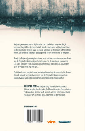 Het boek bij de topserie op VTM Na jaren gevangenschap in Afghanistan komt 'de Reiger' ongezien België binnen en begint hier zijn terroristisch plan te ontvouwen: het land moet lijden en de Reiger weet precies waar, en vooral wanneer, hij de Belgen het hardst kan treffen. De komende nationale feestdag wordt er één om niet snel te vergeten... Terwijl de Reiger zijn wraakplan uitvoert, doet het team van Alexander Van Praet van de Belgische Staatsveiligheid er alles aan om de aanslag te voorkomen. Een ware klopjacht volgt, maar ze vechten een race tegen de klok. Bovendien is bij de Reiger niets wat het lijkt... De Reiger is een compleet nieuw verhaal gebaseerd op de vtm-serie De Bunker die zich afspeelt bij de Antwerpse cel van de Belgische Staatsveiligheid die opereert vanuit De Bunker, een geheim en ondergronds hoofdkwartier.