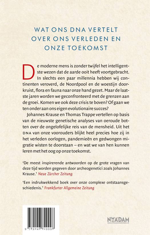 Johannes Krause en Thomas Trappe vertellen over de ongelofelijke reis van de mensheid, over fatale tegenslagen en de triomfen van een paar bevolkingsgroepen. De bestsellerauteurs laten op basis van de nieuwste wetenschappelijke inzichten zien hoe wij in het verleden het hoofd wisten te bieden aan oorlogen, pandemieën en migratie, en welke gevaren schuilgaan achter de ongebreidelde macht van de mens.
