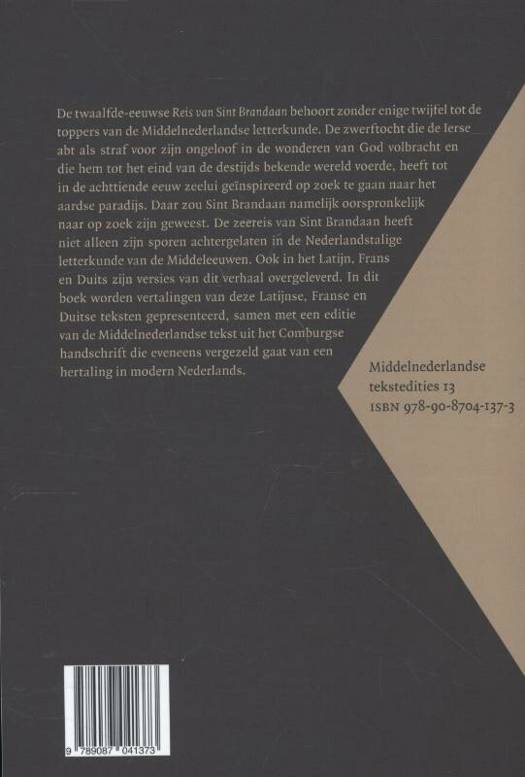 De twaalfde-eeuwse Reis van Sint Brandaan behoort zonder enige twijfel tot de toppers van de Middelnederlandse letterkunde. De zwerftocht die de Ierse abt als straf voor zijn ongeloof in de wonderen van God volbracht en die hem tot het eind van de destijds bekende wereld voerde, heeft tot in de achttiende eeuw zeelui geïnspireerd op zoek te gaan naar het aards paradijs. Daar zou Sint Brandaan namelijk oorspronkelijk naar op zoek zijn geweest. De zeereis van Sint Brandaan heeft niet alleen zijn sporen achtergelaten in de Nederlandstalige letterkunde van de Middeleeuwen. Ook in het Latijn, Frans en Duits zijn versies van dit verhaal overgeleverd. In dit boek worden vertalingen van deze Latijnse, Frans en Duitse teksten gepresenteerd, samen met een editie van de Middelnederlandse tekst uit het Comburgse handschrift die eveneens vergezeld gaat van een hertaling in modern Nederlands.
