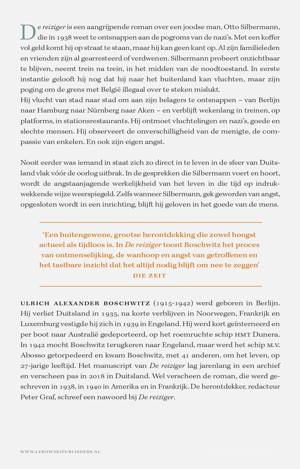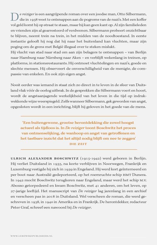 De reiziger is een aangrijpende roman over een joodse man, Otto Silbermann, die in 1938 weet te ontsnappen aan de nazipogroms, maar daardoor alles verliest: zijn bezittingen, zijn waardigheid en uiteindelijk ook zijn verstand. Hij vlucht van stad naar stad om aan zijn achtervolgers te ontsnappen - van Berlijn naar Hamburg, van Nürnberg naar Aken. Hij verblijft wekenlang in treinen, wetende dat hij in de val zit, maar blijft desondanks geloven in het goede in de mens. Zelfs wanneer hij, gek geworden van angst, opgesloten wordt in een inrichting, blijft hij aan dat idee vasthouden.