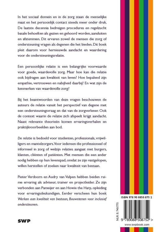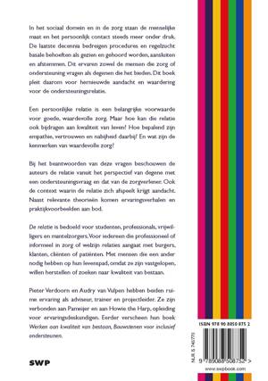 Bij het beantwoorden van deze vragen beschouwen de auteurs de relatie vanuit het perspectief van degene met een ondersteuningsvraag en dat van de zorgverlener. Ook de context waarin de relatie zich afspeelt krijgt aandacht. Naast relevante theorieën komen ervaringsverhalen en praktijkvoorbeelden aan bod.