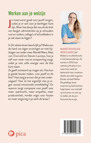 In De relaxte leraar beschrijft juf Maike aan de hand van eigen ervaringen en met bijdragen van onder meer Marald Mens, Kees van Overveld en Steven Laureys, hoe je zelf voor meer rust en ontspanning zorgt, zodat je met volle energie voor de klas kunt staan. Ze geeft antwoord op vragen als: Hoe kun je goede keuzes maken, voor jezelf en de klas? Hoe zorg je ervoor dat je niet onderuitgaat? Hoe zit het eigenlijk met je eigen sociaal-emotionele ontwikkeling? En waarom zorgt compassie voor jezelf voor meer veerkracht, meer empathie, meer productiviteit, minder angst voor fouten en meer zingeving in je werk als leraar?