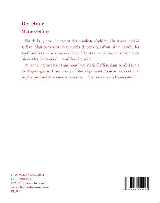 Autant d’interrogations que nous livre Marie Geffray, dans ce récit bouleversant sur la vie d’après-guerre. Le style remarquable de l’auteur nous entraîne au plus profond du cœur des hommes… Vers un retour à l’humanité ?