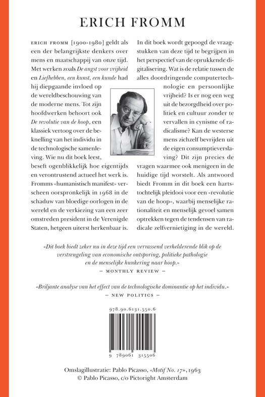 Dit zijn precies de vragen waarmee ook menigeen in de huidige tijd worstelt. Als antwoord biedt Fromm in dit boek een hartstochtelijk pleidooi voor een «revolutie van de hoop», waarbij menselijke rationaliteit en menselijk gevoel samen optrekken tegen de tendensen van radicale zelfvernietiging in de wereld.