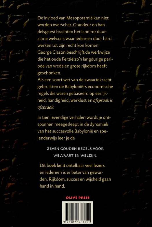 De invloed van Mesopotamië kan niet worden overschat. Grandeur en handelsgeest brachten het land tot duurzame welvaart waar iedereen door hard werken tot zijn recht kon komen. George Clason beschrijft de werkwijze die hen zon grote en langdurige periode van vrede en rijkdom heeft geschonken. Zoals wij de wet van de zwaartekracht toepassen, gebruikten de Babyloniërs economische wetten die waren gebaseerd op eerlijkheid, handigheid en werklust.