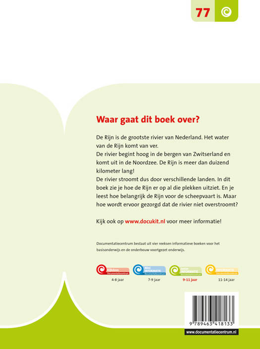 De Rijn is de grootste rivier van Nederland. Het water van de Rijn komt van ver. De rivier begint hoog in de bergen van Zwitserland en komt uit in de Noordzee. De Rijn is meer dan duizend kilometer lang! De rivier stroomt dus door verschillende landen. In dit boek zie je hoe de Rijn er op al die plekken uitziet. En je leest hoe belangrijk de Rijn voor de scheepvaart is. Maar hoe wordt ervoor gezorgd dat de rivier niet overstroomt?
