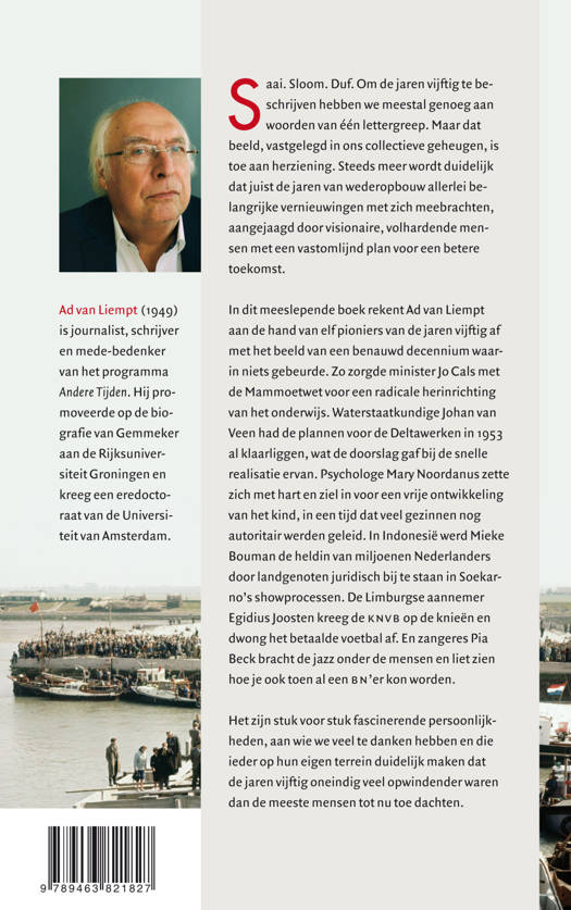 Saai. Sloom. Duf. Om de jaren vijftig te beschrijven hebben we meestal genoeg aan woorden van één lettergreep. Maar dat beeld, vastgelegd in ons collectieve geheugen, is duidelijk toe aan herziening. Steeds meer wordt duidelijk dat juist de jaren van wederopbouw allerlei belangrijke vernieuwingen met zich meebrachten, aangejaagd door visionaire, volhardende mensen met een vastomlijnd plan voor een betere toekomst.In het meeslepende De roaring fifties rekent Ad van Liempt aan de hand van een tiental pioniers van de jaren vijftig af met het beeld van een benauwd decennium waarin niets gebeurde. Zo zorgde minister Jo Cals met de Mammoetwet voor een radicale herinrichting van het onderwijs. Waterstaatkundige Johan van Veen had de plannen voor de Deltawerken in 1953 al klaarliggen, wat de doorslag gaf bij de snelle realisatie ervan. Psychologe Mary Noordanus zette zich met hart en ziel in voor een vrije ontwikkeling van het kind, in een tijd dat veel gezinnen nog autoritair werden geleid. In Indië werd Mieke Bouman de heldin van miljoenen Nederlanders door landgenoten juridisch bij te staan in Soekarno’s showprocessen. De Limburgse aannemer Egidius Joosten kreeg de KNVB op de knieën en dwong het betaalde voetbal af. En zangeres Pia Beck bracht de jazz onder de mensen en liet zien hoe je ook toen al een BN’er kon worden.Het zijn stuk voor stuk fascinerende persoonlijkheden, aan wie we veel te danken hebben en die ieder op hun eigen terrein duidelijk maken dat de roaring fifties oneindig veel opwindender waren dan de meeste mensen tot nu toe dachten.