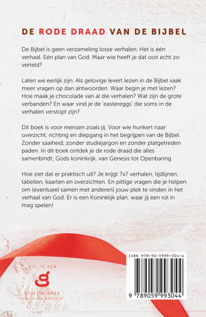 De Bijbel is geen verzameling losse verhalen. Het is één verhaal. Eén plan van God. Maar wie heeft je dat ooit echt zo verteld? Laten we eerlijk zijn. Als gelovige levert lezen in de Bijbel vaak meer vragen op dan antwoorden. Waar begin je met lezen? Hoe maak je chocolade van al die verhalen? Wat zijn de grote verbanden? En waar vind je de ‘eastereggs’ die soms in de verhalen verstopt zijn? Dit boek is voor mensen zoals jij. Voor wie hunkert naar overzicht, richting en diepgang in het begrijpen van de Bijbel. Zonder saaiheid, zonder studiejargon en zonder platgetreden paden. In dit boek ontdek je de rode draad die alles samenbindt; Gods koninkrijk, van Genesis tot Openbaring. Hoe ziet dat er praktisch uit? Je krijgt 7x7 verhalen, tijdlijnen, tabellen, kaarten en overzichten. En pittige vragen die je helpen om (eventueel samen met anderen) jouw plek te vinden in het verhaal van God. Er is een Koninklijk plan, waar jij een rol in mag spelen