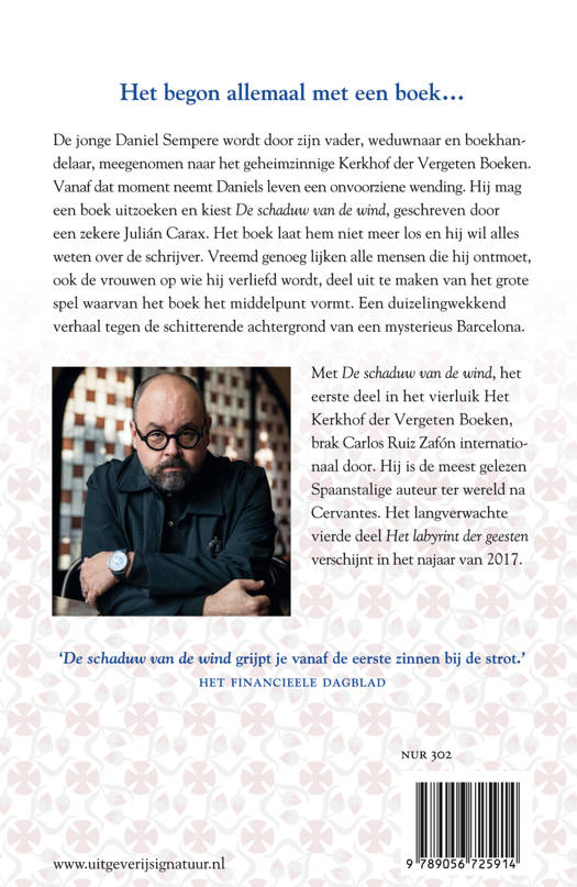 In het oude centrum van Barcelona ligt het Kerkhof der Vergeten Boeken. Hoofdpersoon Daniel Sempere wordt door zijn vader, weduwnaar en boekhandelaar, meergenomen naar de geheimzinnige, verborgen wereld van verhalen.