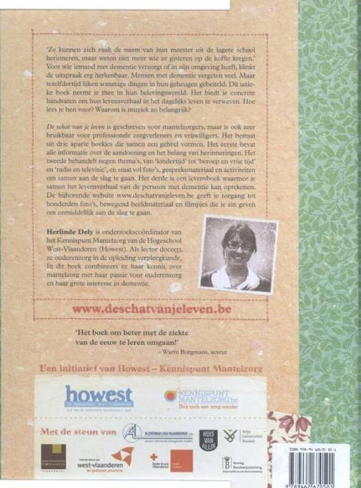 ‘Ze kunnen zich vaak de naam van hun meester uit de lagere school herinneren, maar weten niet meer wie ze gisteren op de koffie kregen.’ Voor wie iemand met dementie verzorgt of in zijn omgeving heeft, klinkt de uitspraak erg herkenbaar. Mensen met dementie vergeten veel. Maar tezelfdertijd lijken sommige dingen in hun geheugen gebeiteld. Dit unieke boek neemt je mee in hun belevingswereld. Het biedt je concrete handvaten om hun levensverhaal in het dagelijks leven te verweven. Hoe lees je hen voor? Waarom is muziek zo belangrijk? De schat van je leven is geschreven voor mantelzorgers, maar is ook zeer bruikbaar voor professionele zorgverleners en vrijwilligers. Het bestaat uit drie aparte boekjes die samen een geheel vormen. Het eerste bevat alle informatie over de aandoening en het belang van herinneringen. Het tweede behandelt negen thema’s, van ‘kindertijd’ tot ‘beroep en vrije tijd’ en ‘radio en televisie’, en staat vol foto’s, gespreksmateriaal en activiteiten om samen aan de slag te gaan. Het derde is een levensboek waarmee je samen het levensverhaal van de persoon met dementie kan optekenen. De bijhorende website www.deschatvanjeleven.be geeft je toegang tot honderden foto’s, bewegend beeldmateriaal en filmpjes die je zin geven om onmiddellijk aan de slag te gaan.