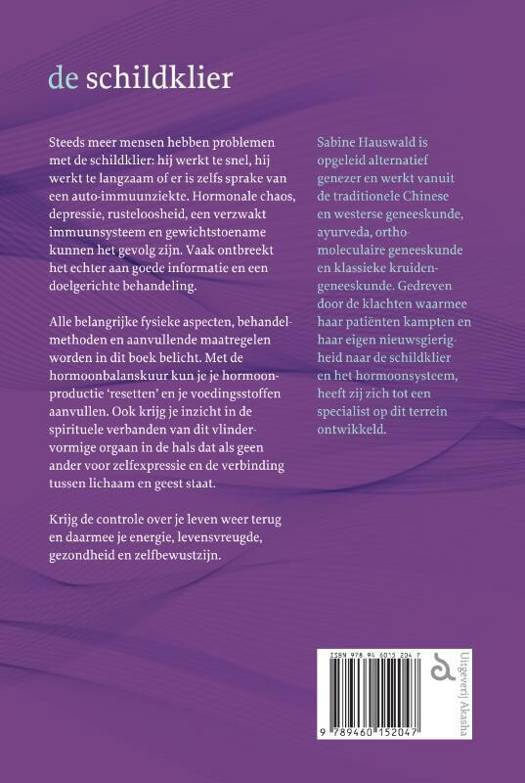 Sabine Hauswald is opgeleid alternatief genezer en werkt vanuit de traditionele Chinese en westerse geneeskunde, ayurveda, orthomoleculaire geneeskunde en klassieke kruidengeneeskunde. Gedreven door de klachten waarmee haar patiënten kampten en haar eigen nieuwsgierigheid naar de schildklier en het hormoonsysteem, heeft zij zich tot een specialist op dit terrein ontwikkeld.