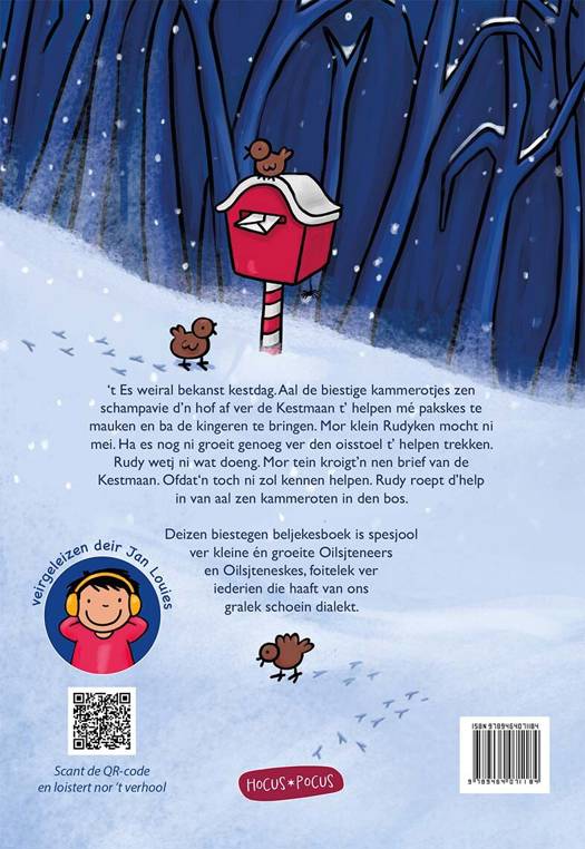 ‘t Es weiral bekanst kestdag. Aal de biestige kammerotjes zen schampavie d’n hof af ver de Kestmaan t’ helpen mé pakskes te mauken en ba de kingeren te bringen. Mor klein Rudyken mocht ni mei. Ha es nog ni groeit genoeg ver den oisstoel t’ helpen trekken. Rudy wetj ni wat doeng. Mor tein kroigt’n nen brief van de Kestmaan. Ofdat‘n toch ni zol kennen helpen. Rudy roept d’help in van aal zen kammeroten in den bos.