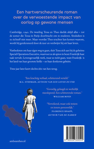 Cambridge, 1942. De tweeling Tessa en Theo deelde altijd alles – tot de zomer die Tessa in Parijs doorbracht om te studeren. Sindsdien is ze zichzelf niet meer. Maar voordat Theo erachter kan komen waarom, wordt hij gerekruteerd door de RAF en verdwijnt hij uit haar leven.