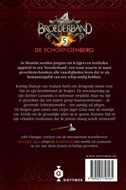 'De schorpioenberg' is deel 5 van de meeslepende 'Broederband'-reeks van John Flanagan, de auteur van de internationale bestsellerserie 'De Grijze Jager'. Deze spannende spin-off is geschikt voor lezers van 12 jaar en ouder.In Skandia worden jongens tot krijgers en zeelieden opgeleid in een broederband - een team waarin ze naast gevechtstechnieken ook alle vaardigheden leren die ze als bemanningslid van een schip nodig hebben.In 'De schorpioenberg' heeft koning Duncan van Araluen een dringende opdracht voor Hal en zijn broederband de Reigers. De moordaanslag op zijn dochter, prinses Cassandra, is weliswaar verijdeld, maar de koning is bang dat de daders - leden van de gevreesde Schorpioensekte - niet zullen rusten voordat ze hun opdracht hebben vervuld.Samen met Grijze Jager Gilan gaan De Reigers naar de woestijn van Arrida, op zoek naar de leider van de sekte. Kunnen Hal en zijn vrienden voorkomen dat de prinses alsnog wordt vermoord?