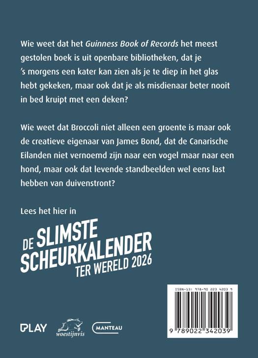 Wie weet dat het Guinness Book of Records het meest gestolen boek is uit openbare bibliotheken, dat je 's morgens een kater kan zien als je te diep in het glas hebt gekeken, maar ook dat je als misdienaar beter nooit in bed kruipt met een deken?