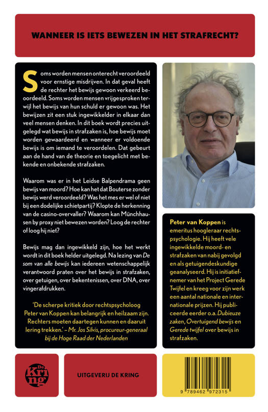 Wanneer is iets bewezen in het strafrecht? Toegankelijk boek vol geruchtmakende en dubieuze zaken. ***** Soms worden mensen onterecht veroordeeld voor ernstige misdrijven. In dat geval heeft de rechter het bewijs gewoon verkeerd beoordeeld. Soms worden mensen vrijgesproken terwijl het bewijs van hun schuld er gewoon was. Het bewijzen zit een stuk ingewikkelder in elkaar dan veel mensen denken. In dit boek wordt precies uitgelegd wat bewijs in strafzaken is. Hoe bewijs moet worden gewaardeerd en wanneer er voldoende bewijs is om iemand te veroordelen. Dat wordt besproken aan de hand van de theorie en toegelicht met bekende en onbekende strafzaken. Waarom was er in het Leidse Balpendrama geen bewijs van moord? Hoe kan het dat Bouterse zonder bewijs werd veroordeeld? Was het mes er wel of niet bij een dodelijke schietpartij? Klopte de herkenning van de casino-overvaller? Waarom kan Münchhausen by proxy niet bewezen worden? Loog de rechter of loog hij niet? Bewijs mag dan ingewikkeld zijn, hoe het werkt wordt in dit boek helder uitgelegd. Na lezing van DE SOM VAN ALLE BEWIJS kan iedereen wetenschappelijk verantwoord praten over het bewijs in strafzaken, over getuigen, over bekentenissen, over DNA, over vingerafdrukken.