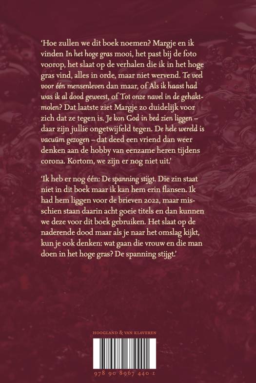 ‘Hoe zullen we dit boek noemen? Margje en ik vinden In het hoge gras mooi, het past bij de foto voorop, het slaat op de verhalen die ik in het hoge gras vind, alles in orde, maar niet wervend. Te veel voor één mensenleven dan maar, of Als ik haast had was ik al dood geweest, of Tot onze navel in de gehaktmolen? Dat laatste ziet Margje zo duidelijk voor zich dat ze tegen is. Je kon God in bed zien liggen – daar zijn jullie ongetwijfeld tegen. De hele wereld is vacuüm gezogen – dat deed een vriend dan weer denken aan de hobby van eenzame heren tijdens corona. Kortom, we zijn er nog niet uit.’