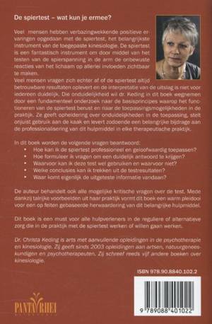 Veel mensen hebben verbazingwekkende positieve ervaringen opgedaan met de spiertest, het belangrijkste instrument van de toegepaste kinesiologie. De spiertest is een fantastisch instrument om door middel van het testen van de spierspanning in de arm de onbewuste reacties van het lichaam op allerlei invloeden zichtbaar te maken. Veel mensen vragen zich echter af of de spiertest altijd betrouwbare resultaten oplevert en de interpretatie van de uitslag is niet voor iedereen duidelijk. Die onduidelijkheid wil dr. Keding in dit boek wegnemen door een fundamenteel onderzoek naar de basisprincipes waarop het functioneren van de spiertest berust en naar de toepassingsmogelijkheden in de praktijk. Ze geeft opheldering over onduidelijkheden in de toepassing, stelt onjuist gebruik aan de kaak en levert zodoende een belangrijke bijdrage aan de professionalisering van dit hulpmiddel in elke therapeutische praktijk.