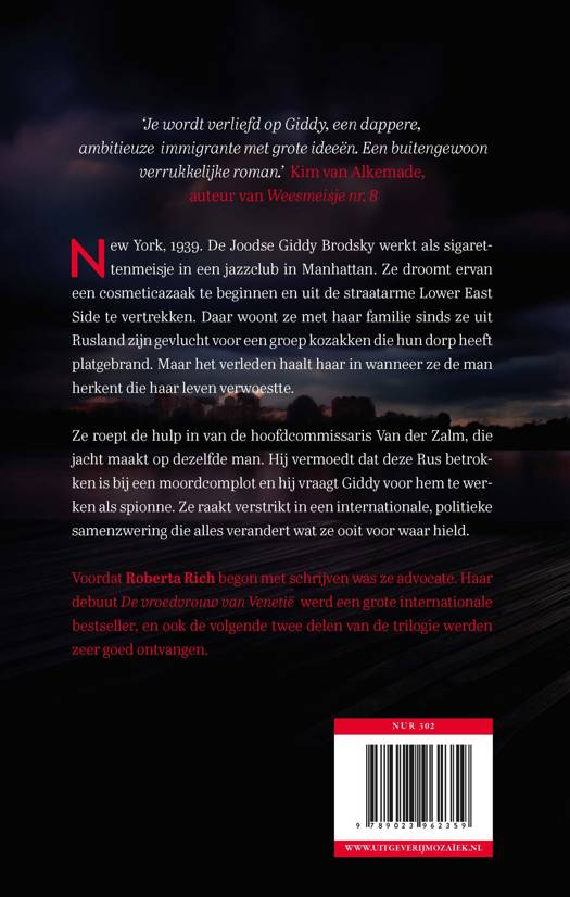 New York, 1939. In ‘De spionne van Manhattan’ van Roberta Rich heeft Giddy Brodsky geluk met haar baantje als sigarettenmeisje in een jazzclub in Manhattan, terwijl de Grote Depressie op zijn hoogtepunt is. Ze droomt ervan een cosmeticazaak te beginnen en de straatarme Lower East Side achter zich te laten, waar ze met haar familie woont sinds ze uit Rusland zijn gevlucht voor een groep Kozakken die hun dorp heeft platgebrand.