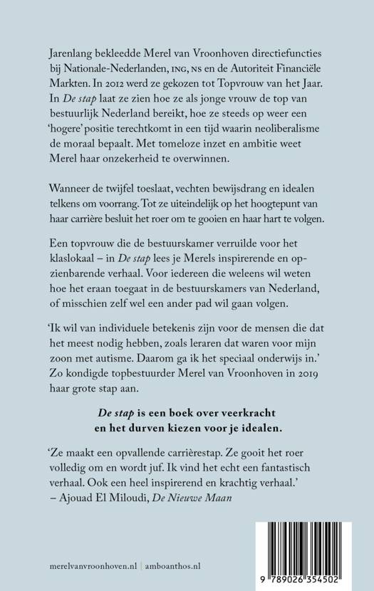 In De stap laat ze zien hoe ze als jonge vrouw de top van bestuurlijk Nederland bereikt, hoe ze steeds op weer een 'hogere' positie terechtkomt in een tijd waarin neoliberalisme de moraal bepaalt. Met tomeloze inzet en ambitie weet Merel haar onzekerheid te overwinnen. Wanneer de twijfel toeslaat, vechten bewijsdrang en idealen telkens om voorrang. Tot ze uiteindelijk op het hoogtepunt van haar carrière besluit het roer om te gooien en haar hart te volgen. Een topvrouw die de bestuurskamer verruilde voor het klaslokaal – in De stap lees je Merels inspirerende en opzienbarende verhaal. Voor iedereen die weleens wil weten hoe het eraan toegaat in de bestuurskamers van Nederland, of misschien zelf wel een ander pad wil gaan volgen.