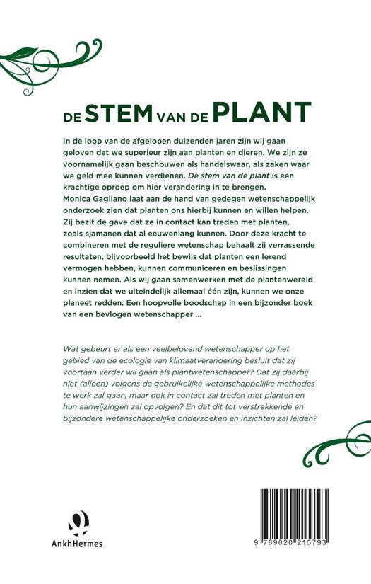 De stem van de plant van wetenschappelijk onderzoeker Monica Gagliano bewijst dat planten en bomen met elkaar communiceren en een heel eigen leven leiden. Aan de hand van vele onderzoeken en experimenten laat zij zien dat planten en bomen wel degelijk kunnen luisteren, leren, overleggen en beslissen. Ze beschikken over vaardigheden die we – volkomen onterecht – tot nu toe alleen aan onszelf en aan dieren toeschreven. En waarom zou het ook anders zijn? Het is tijd dat wij ons botanisch bewustzijn vergroten en gaan luisteren naar de plant. Dat is namelijk de hoogste tijd, zegt die plant, want onze natuurlijke omgeving verdient veel meer respect dan we haar nu geven. Een aanrader voor de lezers van Peter Wohlleben.