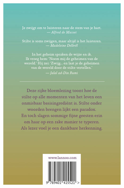 Prachtige bloemlezing met inspirerende teksten over de stilte Je zwijgt om te luisteren naar de stem van je hart. Alfred de Musset Stilte is soms zwijgen, maar altijd is het luisteren. Madeleine Delbrêl In het geheim spraken de wijze en ik. Ik vroeg hem: 'Noem mij de geheimen van de wereld.' Hij zei: 'Zwijg... en laat je de geheimen van de wereld door de stilte vertellen.' Jalal ad-Din Rumi Deze rijke bloemlezing toont hoe de stilte op alle momenten van het leven een onmisbaar basisingrediënt is. Stilte onder woorden brengen lijkt een paradox. En toch slagen sommige fijne geesten erin om haar op een rake manier te typeren. Als lezer voel je een dankbare herkenning.