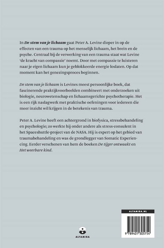In 'De stem van je lichaam' gaat Peter A. Levine, grondlegger van Somatic Experiencing en auteur van de bestseller 'De tijger ontwaakt', dieper in op de effecten van een trauma op het menselijk lichaam, het brein en de psyche. Hij toont aan dat een trauma geen ziekte of afwijking is, maar een opgelopen verwonding als gevolg van angst, hulpeloosheid en verlies. Als de wond geen aandacht krijgt, kan iemand er nog jarenlang last van hebben. 'De stem van je lichaam' belicht bovenal het feit dat compassie het krachtigste hulpmiddel is bij de verwerking van een trauma. Door te luisteren naar je lichaam, lukt het je om de geblokkeerde energie los te laten en deze compassie te voelen. Op dat moment kan het genezingsproces beginnen. 'De stem van je lichaam' is Levines meest persoonlijke boek, dat fascinerende praktijkvoorbeelden combineert met onderzoeken uit de biologie, neurowetenschap en de lichaamsgerichte psychotherapie.