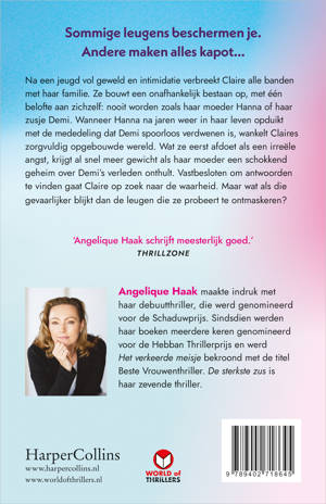 De sterkste zus is de nieuwe thriller van bestsellerauteur Angelique Haak. Na een jeugd vol geweld en intimidatie verbreekt Claire alle banden met haar familie. Ze bouwt een onafhankelijk bestaan op, met één belofte aan zichzelf: nooit worden zoals haar moeder Hanna of haar zusje Demi. Wanneer Hanna na jaren weer in haar leven opduikt met de mededeling dat Demi spoorloos verdwenen is, wankelt Claires zorgvuldig opgebouwde wereld. Wat ze eerst afdoet als een irreële angst, krijgt al snel meer gewicht als haar moeder een schokkend geheim over Demi's verleden onthult. Vastbesloten om antwoorden te vinden gaat Claire op zoek naar de waarheid. Maar wat als die gevaarlijker blijkt dan de leugen die ze probeert te ontmaskeren? 'Angelique Haak schrijft meesterlijk goed.' ThrillZone 'Deze thriller heeft een internationale allure door de filmische en beeldende schrijfstijl.' Jury Hebban Thrillerprijs