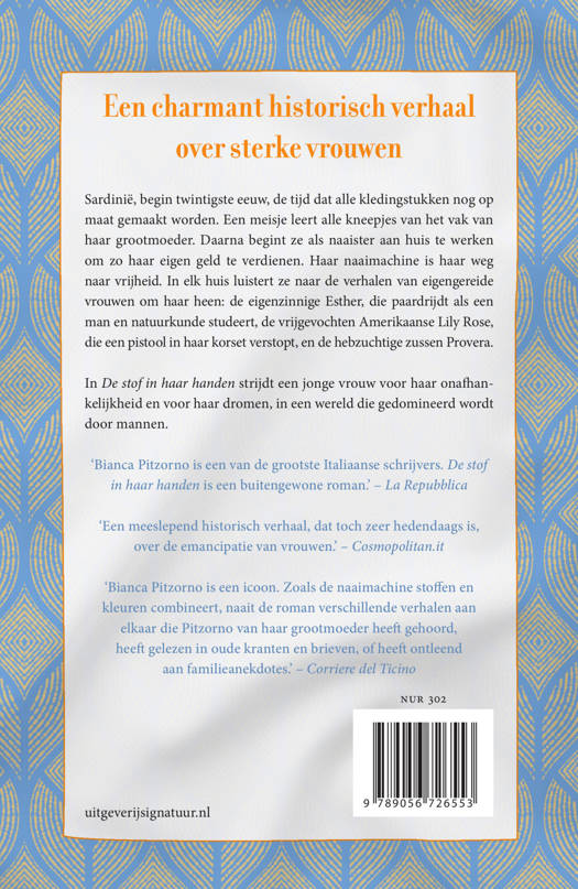 In elk huis, tijdens het opmeten, het knippen, het naaien, luistert ze naar de verhalen van eigengereide vrouwen om haar heen: de eigenzinnige Esther, die paardrijdt als een man en natuurkunde studeert, de vrijgevochten Amerikaanse Lily Rose die een pistool in haar korset verstopt en de hebzuchtige zussen Provera. In De stof in haar handen strijdt een jonge vrouw voor haar onafhankelijkheid en voor haar dromen, in een wereld die gedomineerd wordt door mannen.