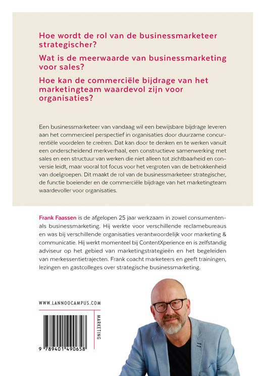 De businessmarketeer van vandaag wil een bewijsbare bijdrage leveren aan het commercieel perspectief in organisaties. Dat doet hij door te denken en werken vanuit een onderscheidend merkverhaal, een constructieve samenwerking met sales en een structuur van werken die niet alleen tot zichtbaarheid en conversie leidt, maar vooral tot focus voor prospecteren en het vergroten van de betrokkenheid van doelgroepen.
