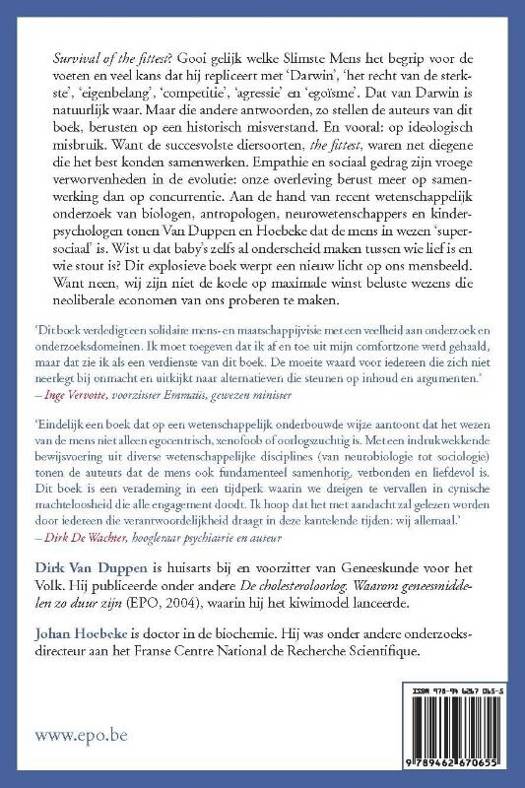 Survival of the fittest? Gooi gelijk welke Slimste Mens het begrip voor de voeten en veel kans dat hij repliceert met ‘Darwin’, ‘het recht van de sterkste’, ‘eigenbelang’, ‘competitie’, ‘agressie’ en ‘egoïsme’. Dat van Darwin is natuurlijk waar. Maar die andere antwoorden, zo stellen de auteurs van dit boek, berusten op een historisch misverstand. En vooral: op ideologisch misbruik. Want de succesvolste diersoorten, the fittest, waren net diegene die het best konden samenwerken. Empathie en sociaal gedrag zijn vroege verworvenheden in de evolutie: onze overleving berust meer op samenwerking dan op concurrentie. Aan de hand van recent wetenschappelijk onderzoek van biologen, antropologen, neurowetenschappers en kinderpsychologen tonen Van Duppen en Hoebeke dat de mens in wezen ‘supersociaal’ is. Wist u dat baby’s zelfs al onderscheid maken tussen wie lief is en wie stout is? Dit explosieve boek werpt een nieuw licht op ons mensbeeld. Want neen, wij zijn niet de koele winstwolven die neoliberale economen van ons proberen maken.