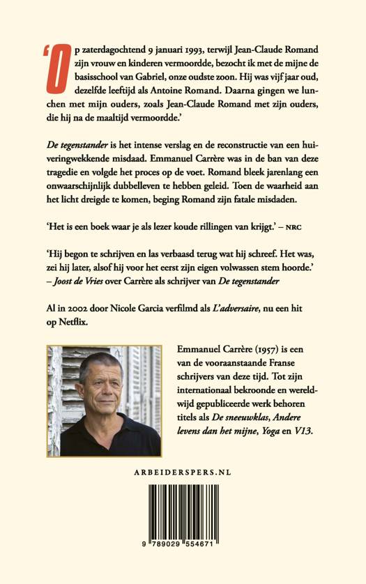 De tegenstander is het intense verslag en de reconstructie van een huiveringwekkende misdaad. Emmanuel Carrère was in de ban van deze tragedie en volgde het proces op de voet. Romand bleek jarenlang een onwaarschijnlijk dubbelleven te hebben geleid. Toen de waarheid aan het licht dreigde te komen, beging Romand zijn fatale misdaden.