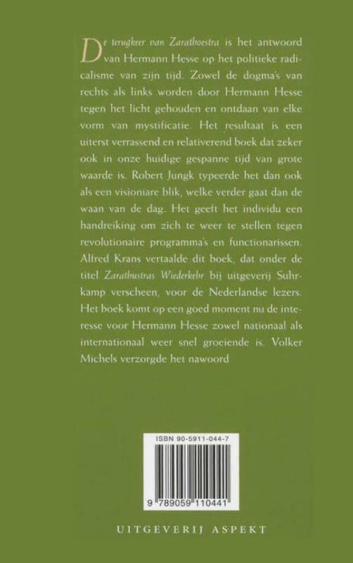 'De terugkeer van Zarathoestra' is het antwoord van Hermann Hesse op het politiek radicalisme van zijn tijd. Zowel de dogma's van rechts als links worden door Hermann Hesse tegen het licht gehouden en ontdaan van elke vorm van mystificatie. Het resultaat is een uiterst verrassend en relativerend boek dat zeker ook in onze huidige gespannen tijd van grote waarde is. Robert Jungk typeerde het dan ook als een visionaire blik, welke verder gaat dan de waan van de dag. 'De terugkeer van Zarathoestra' geeft het individu een handreiking om zich te weer te stellen tegen revolutionaire programma's en functionarissen.