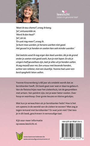 ‘Moet ik nou chemo?’ vroeg ik bang. ‘Ja!’ antwoordde ze. ‘Word ik dan kaal?’ ‘Ja!’ zei ze. ‘En wat nog meer?’ vroeg ik. ‘Je kunt moe worden. Je hersens werken niet goed. Het gevoel in je handen en voeten kan ook minder worden.’ Dat laatste vond ik nog erger dan kaal worden. Als je de grond onder je voeten niet goed voelt, kun je niet lopen. En als je vingers half gevoelloos zijn, laat je alles uit je handen vallen. Ik zag mezelf voor me. Een vrouw met bevende handen, achter een rollator, met een dweiltje. Yvonne had weer een bord spaghetti laten vallen. Yvonne Kroonenberg is 68 jaar als ontdekt wordt dat ze borstkanker heeft. Dit boek gaat over wat er daarna gebeurt. Van de fietstochtjes naar het ziekenhuis, tot de gesprekken met artsen. Van patiënt zijn, tot je weer beter voelen. Over hoop en wanhoop. Over grote keuzes en kleine gelukjes. Wat kun je verwachten als je borstkanker hebt? Hoe is het om opeens in de wereld van de zieken te wonen? Wat zeg je tegen iemand met borstkanker? En wat juist niet? Dat lees je in dit boek, geschreven in eenvoudige taal.