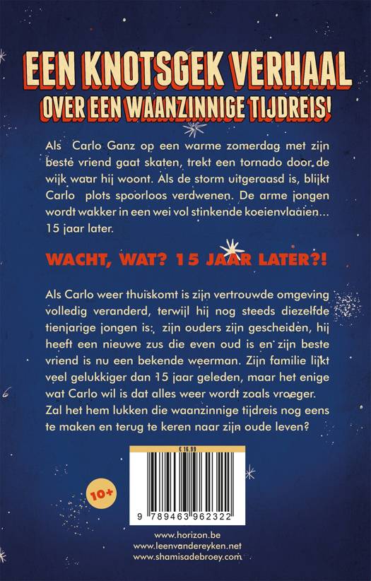 Als Carlo Ganz op een warme zomerdag met zijn beste vriend gaat skaten, raast een tornado door de wijk. Als de storm uitgebulderd is, blijkt Carlo plots spoorloos verdwenen. De arme jongen wordt wakker in een wei... 15 jaar later. Wacht, wat? 15 jaar later?!Carlo's omgeving is volledig veranderd, terwijl hij nog steeds die tienjarige jongen is: zijn ouders zijn gescheiden, hij heeft een nieuwe zus die even oud is en zijn beste vriend is nu een bekende weerman. Zijn familie lijkt veel gelukkiger dan 15 jaar geleden, maar het enige wat Carlo wil is dat alles weer wordt zoals vroeger.
