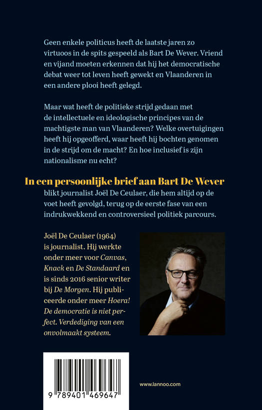 Met nieuw nawoord: 'Eindelijk concurrentie voor De Wever.' Geen enkele politicus heeft de laatste jaren zo virtuoos in de spits gespeeld als Bart De Wever. Vriend en vijand moeten erkennen dat hij het democratische debat weer tot leven heeft gewekt en Vlaanderen in een andere plooi heeft gelegd. Maar wat heeft de politieke strijd gedaan met de intellectuele en ideologische principes van de machtigste man van Vlaanderen? Welke overtuigingen heeft hij opgeofferd, waar heeft hij bochten genomen in de strijd om de macht? En hoe inclusief is zijn nationalisme nu echt? In een persoonlijke brief aan Bart De Wever blikt journalist Joël De Ceulaer, die hem altijd op de voet heeft gevolgd, terug op de eerste fase van een indrukwekkend en controversieel politiek parcours.