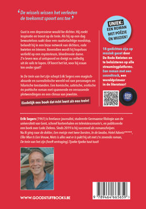 Gust is een depressieve would-be dichter. Hij zoekt inspiratie en troost op de trein. Als hij op een dag bewusteloos raakt door een raadselachtige noodstop, belandt hij in een bizar netwerk van dichters, rode kwieten en trienen. Bovendien wordt hij hopeloos verliefd op een mysterieuze, bloedmooie dame. Z’n leven was al ontspoord en dreigt nu volledig uit de rails te lopen. Of keert het lot, voor hij eraan ten onder gaat? In ‘De trein van het zijn’ schept Erik Segers een magisch-absurde en surrealistische wereld vol rare personages en hilarische toestanden. Een komische, satirische, erotische én poëtische roman met spannende en verrassende plotwendingen en een climax van jewelste. Eindelijk een boek dat écht leest als een trein!