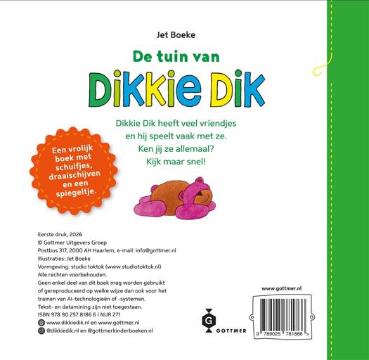 'De tuin van Dikkie Dik' is een stevig kartonboek met schuifjes, draaischijf en spiegeltje, speciaal voor de jongste fans van de beroemdste oranje kat van Nederland.