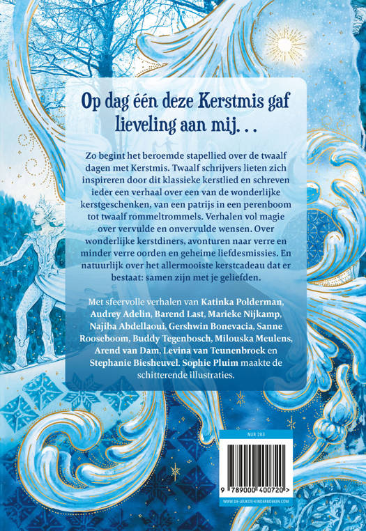 In deze sfeervolle kerstbundel zijn twaalf verhalen opgenomen, geïnspireerd op de geschenken uit het beroemde 'The Twelve Days of Christmas', dat geestig werd vertaald door Jan Rot. Van 'De patrijs in de perenboom' van Katinka Polderman, 'De zeven zwoele zwanen' van Sanne Rooseboom, 'De zes moederganzen' van Gershwin Bonevacia tot 'De twaalf rommeltrommels' van Stephanie Biesheuvel: elk verhaal biedt een eigen fantasievolle, inspirerende of magische kijk op Kerstmis.