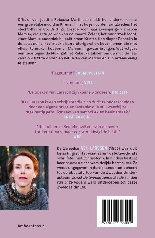 Officier van justitie Rebecka Martinsson leidt het onderzoek naar een gruwelijke moord in Kiruna, in het hoge noorden van Zweden. Het slachtoffer is Soll-Britt en zij zorgde voor haar negenjarige kleinzoon Marcus, die getuige was van de moord. Zolang het onderzoek loopt, vindt Marcus onderdak bij politieman Krister. Hoe dieper Rebecka in de zaak duikt, hoe meer bizarre sterf - gevallen bovenkomen die met elkaar te maken hebben en Marcus in gevaar brengen. Het is ooit begonnen bij de dood van Frans Uusitalo, die een erfenis naliet. Wat volgt is een race tegen de klok. Zal het Rebecka lukken om de moordenaar van Soll-Britt te vinden en het leven van Marcus en zijn erfenis veilig te stellen? Åsa Larsson weet als geen ander de spanning subtiel op te bouwen. Terwijl de plot zich ontwikkelt, laat Larsson haar lezers kennismaken met het harde leven van Lapland en de taaie en getekende bewoners ervan.